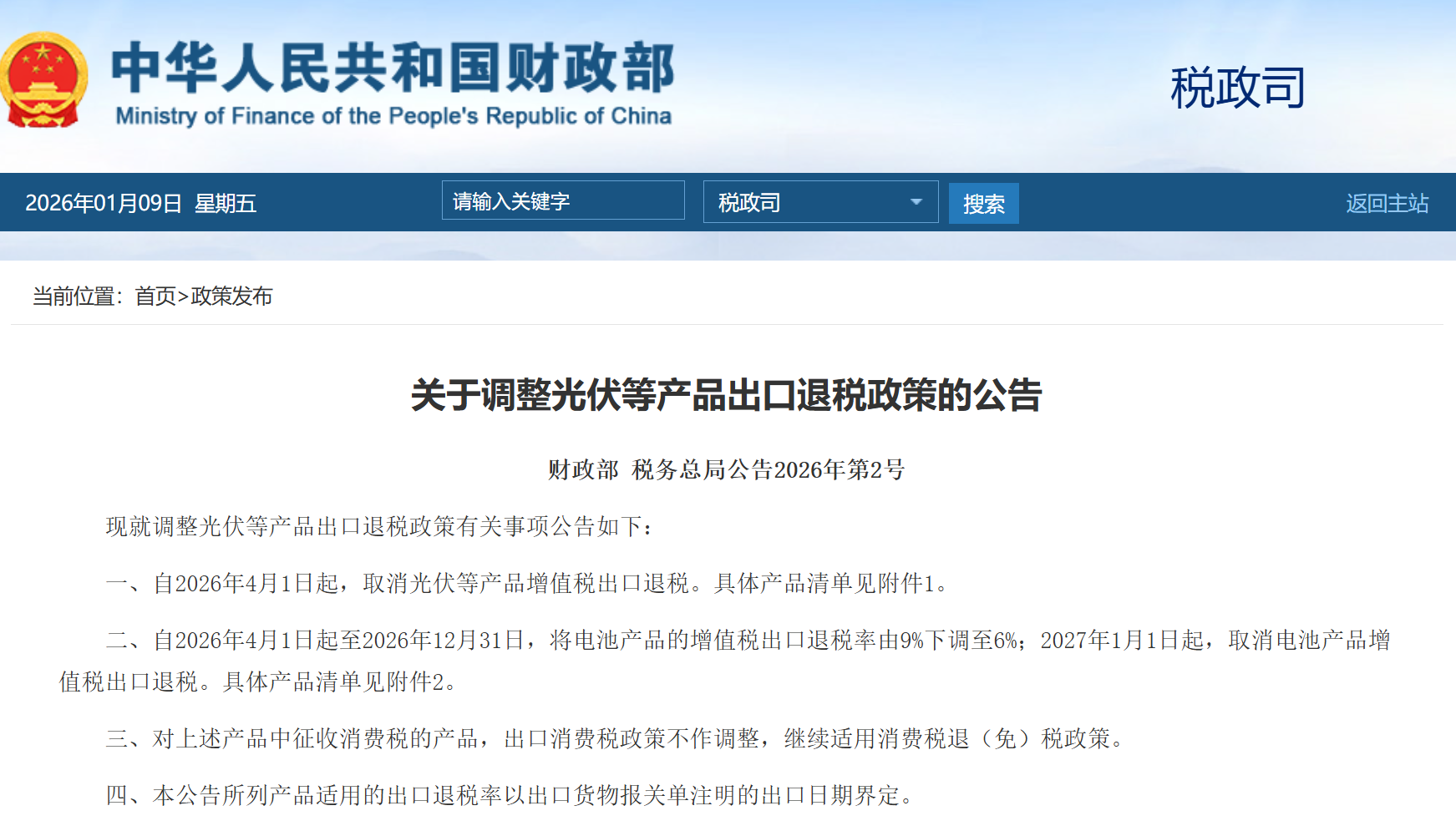 Introduction: On January 9th, the Ministry of Finance and the State Taxation Administration issued a notice on adjusting the export tax rebate policies for certain products: As of April 1, 2026, the export tax rebate for products such as photovoltaics will be abolished. From April 1, 2026 to December 31, 2026, the export tax rebate rate for battery products will be reduced from 9% to 6%; starting from January 1, 2027, the export tax rebate for battery products will be abolished.